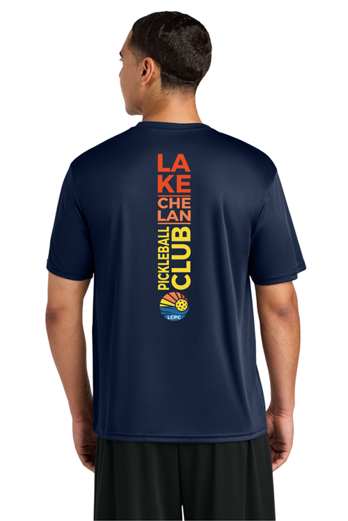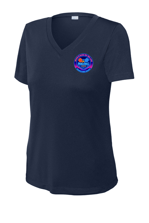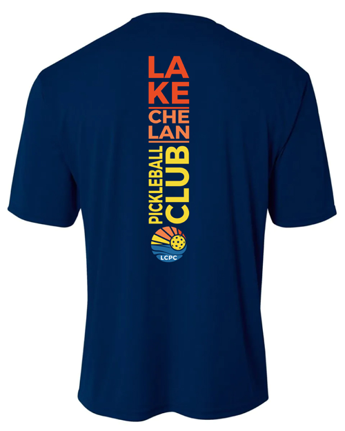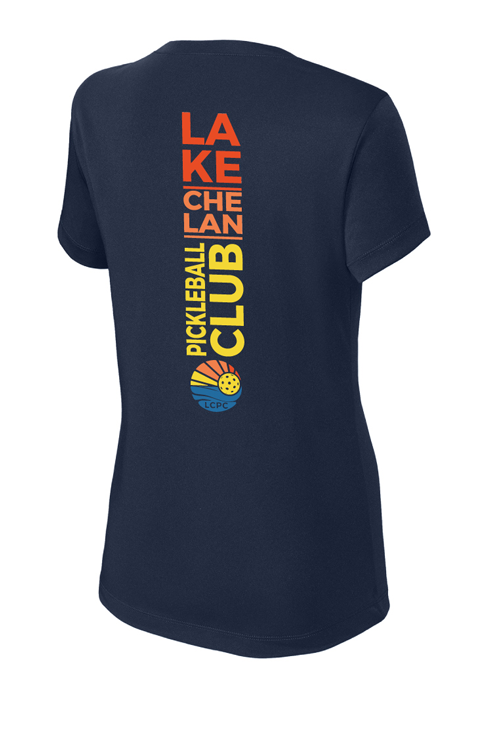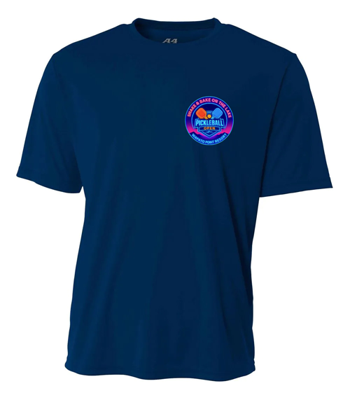 Shirts are Quality Dri Fit Navy Blue Short Sleeve with Wapato Point Tournament Logo on the Front and Lake Chelan Pickleball Club Logo on the back